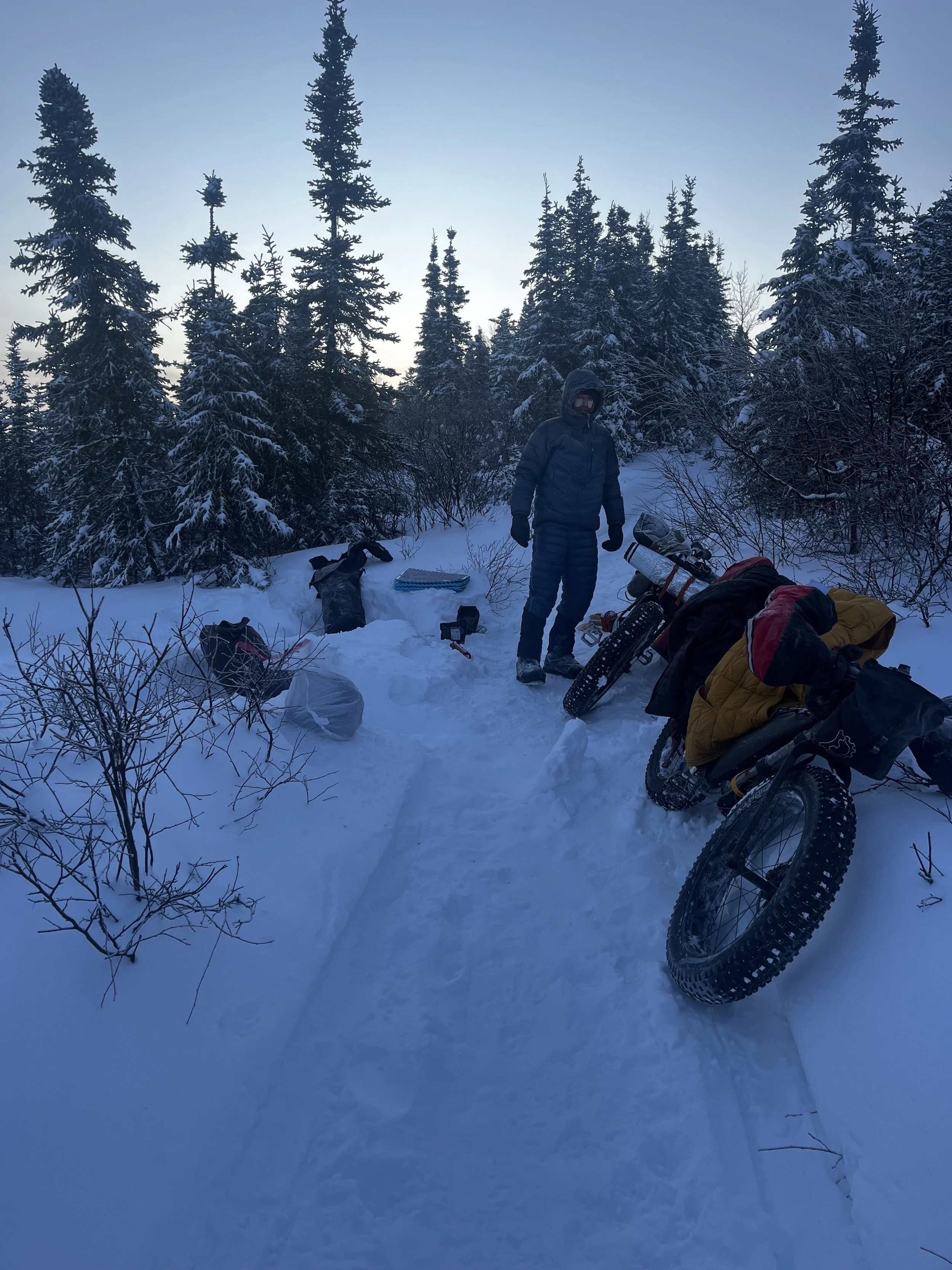 The next 30 miles were crazy, full of steep hike-a-bikes and fast downhills. We were pushing the pace pretty hard and probably neglected eating enough that day which came to bite us about 5 miles away from the cabin. 5 miles doesn’t sound like much but at the pace of this part of the trail it could be an hour and a half or more. All of a sudden Kenneth dropped to one knee and said, “Zach I am done”. I was taken off guard but checked in with my riding companion and suggested we set up bivies right away in which he agreed. As we were getting our gear out and ready, Kenneth was grabbing gear out of his packs with no gloves at what we later found to be -45. His finger tips turned white and we knew we had to do something quick. While he attempted to warm them with hand warmers I grabbed my stove and fired it up in hopes this would also help quickly fix the situation. Ultimately, Kenneth got on top of the issue right away and avoided any major long term frost bite damage. Thankfully. We both agreed the next day's push would need to be smart and that we would need to ensure we stopped to fuel ourselves often to avoid any repeat situations. We were extremely lucky that we stayed warm that night and were able to get going the following day after consuming some decent calories.